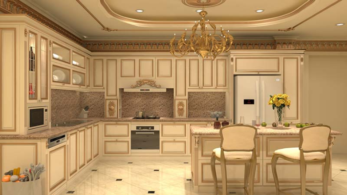 Sử dụng gam màu vàng đồng không chỉ làm nổi bật lên phong cách cổ điển mà vẫn giữ được nét tinh tế, sang trọng của không gian nhà bếp. Để làm điểm nhấn cho cả căn phòng, gia chủ có thể kết hợp gam màu vàng với trắng, trắng kem, trắng sứ, thể hiện tinh thần ấm cúng, gắn kết trong mỗi bữa ăn gia đình, mà còn “ăn gian” được diện tích thật của phòng bếp.
